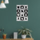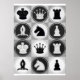 Black and White Chess Pieces Pattern Poster Print. A stylish chess pattern with king, queen, rook, knight, bishop and pawn chess icons on a chessboard square pattern poster print. This cool, nerdy chess poster gift is fully customisable, add your text and images.