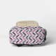 A Chevron pattern made up of greys and magenta are highlighted with a soft beige, chequered print.