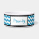 Stylish ceramic dog bowl designed with a blue & white chevron zigzag pattern and personalised with your pet's name.