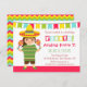 Celebrate a kids birthday with a colourful Mexican Fiesta! This invitation is perfect with its bright choice of colours like red, blue, green and yellow. It features a cute girl with a pony tail wearing a Mexican Sombrero, wide-brimmed hat with interesting geometric and stripes pattern. The girl is shaking a pair of maracas to the music. Bunting banner hangs in the background. Reverse page is colourful and striking chevron zigzag pattern.