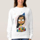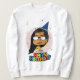 The artwork features a stylish girl with long dark hair, glasses, and golden earrings, wearing a bright yellow outfit and holding a coffee cup ☕. She’s ready to party with a blue birthday hat 🎂, set against a festive geometric background filled with colourful details.