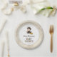 Celebrate your little wizard on the way with this enchanting Harry Potter baby shower plate featuring Harry himself. This charming design includes an adorable illustration of Harry Potter in his Hogwarts robes, riding his broom and ready for magical adventures. The background is sprinkled with colorful stars for a touch of whimsy. Elegant and playful fonts beautifully display your custom details, including the honoree’s name and event date. The unique paper texture of the plate creates a storybook feel, while the back showcases a fun pattern of wizarding world icons such as spell books, potions, cauldrons, and magical creatures. Perfect for any Harry Potter fan, this plate brings a spellbinding touch to your baby shower.