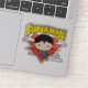 Check out Chibi Superman flying in the clouds with his super hero name overhead and red polka dot shield shape behind him.