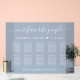 Chic dust blue frosted acrylic wedding seating chart sign for up to 10 tables featuring "our favourite people" in an elegant white script, your names and wedding date joined together by a heart and "We're so glad you're here" in simple modern white typography.