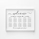 Elegant wedding seating chart poster for up to 10 tables that features "welcome" in a chic script with swashes, your names and wedding date joined together by a heart and "We're so glad you're here" in classic serif typography. If desired, select the digital download option to edit with last minute changes and print locally.
