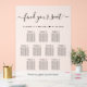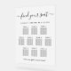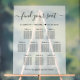Chic frosted acrylic wedding seating chart sign for 10 tables featuring "find your seat" in a stylish script with swashes, your first names and wedding date joined together with a heart and "We're so glad you're here" in classic serif typography.