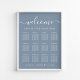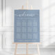 Chic downloadable dusty blue wedding seating chart poster for up to 12 tables featuring "welcome" in a stylish white script with swashes, "Find Your Seat" in elegant white typography and your names and wedding date joined together by a heart. The digital download option allows you to edit with last minute changes and print locally.