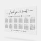 Chic wedding seating chart clear acrylic sign for up to 12 tables featuring "find your seat" in a stylish script with swashes, your names and wedding date joined together with a heart and "We're so glad you're here" in simple modern lettering.