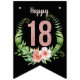 Chic Modern Happy 18th Birthday Bunting Flags with a Rose Gold Glitter "18" on an elegant black background embellished by a floral wreath.