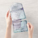 All in One Wedding - Ethereal splash of alcohol ink stains in shades of ocean blue, teal and muted amethyst purple - each section highlighted with a sheer white gold framed overlay framed in gilded gold for an ethereal appeal a beautiful modern abstract design for an all in one wedding invitation complete with pre-addressed detachable meal choice rsvp for your guests to easily mail back - a stunning all in one wedding invitation - Easy to customise template.