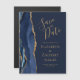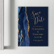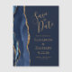 This elegant modern save the date magnet card features a navy blue watercolor agate border trimmed with faux gold glitter. Easily customise the gold coloured text on a navy blue background.