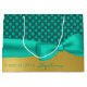 Large elegant gift bag done in a aqua and gold tufted looking diamond pattern, on the top half and a solid gold tone, on the bottom of the bag. Graphics of an aqua satin looking ribbon and bow, decorates between the two backgrounds. Personalise the aqua text, at the bottom, to suit your needs. Matching tissue paper available.