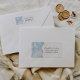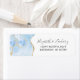 The left-hand edge of this elegant modern wedding invitation return address label features a baby blue watercolor agate border trimmed with faux gold glitter. The customisable text combines charcoal grey handwriting and copperplate fonts on a white background.