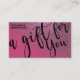 This is the perfect gift certificate business card for a trendy, stylish, girly, and modern businesswoman. This design features a simple black handwritten brush script typography on a faux printed sparkly berry pink glitter and berry pink ombre gradient glamourous and chic background. It's the perfect way to allow your customers to buy a gift for their family and friends and at the same time promote your business.
