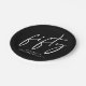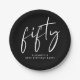 Elegant 50th birthday party black paper plates featuring "fifty" showcased in a chic white script.