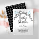 This chic black and white baby shower design features a ribbon, bow and polka dot design.