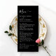 This chic black and white minimalist dinner menu offers a sophisticated, modern touch to your wedding reception. Featuring white script on a bold black background, this design is perfect for couples who want to make a statement with their table decor. The sleek and stylish look highlights your dinner selections in a refined way, making it a standout addition to any celebration. Matching items available.