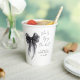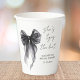 Elegant paper cups for your bridal shower featuring a beautiful watercolor of a black coquette bow, "She's tying the knot" in a chic calligraphy script, and the bride's name and shower date in simple modern lettering.