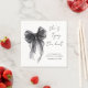 Chic napkins for your bridal shower featuring a delicate watercolor of a black coquette bow, "She's tying the knot" in a modern calligraphy script, and the bride's name and the shower date in simple lettering.