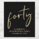 Chic black 40th birthday party wine labels that feature "forty" showcased in a modern gold script and your name and the date in simple gold lettering.