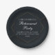 This chic black and gold retirement party paper plate features a modern geometric hexagon around your personalised message in white typography. Elegant decor for a retiree to be celebrated by friends and family at the end of their career.