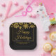 Chic corporate Christmas party plate with Happy Holidays written in elegant gold cursive script under a beautiful border of snowflakes falling on modern black holiday decor. Customise these professional holiday plates with your company or business name.