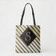 Black and pale gold watercolor stripes cross diagonally beneath a big diamond-shaped black cube. Your initial, large and in an elegant open font, is centered on the diamond, set slightly higher than center for balance of a loaded bag. Both front and back are the same. You'll love toting all your necessities in this elegant black and gold bag. It's ideal for elegant women, those who loved personalized distinctive tote bags,