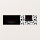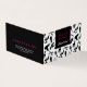 Folded referral card for a hair salon featuring a pattern of tools used by a hair stylist in black and white, with hot pink as an accent colour. Add your referral information and conditions inside the folded card, along with room for the referral's name and other info. Add your business name and contact information in the back. A chic referral card for a hair salon!