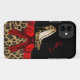Fashionable iPhone 11 case done in black, on the top and a spotted brown and black jaguar print, on the bottom. Graphics of a red satin ribbon and bow decorates the middle and a pair of jaguar print stiletto heels are on the top half. Personalize the red text for yourself or as a purrfect gift idea.