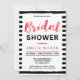 This stylish Bridal Shower invitation features a chic and modern black and white stripes background and the word "Bridal" in red watercolor. This invitation also includes a patterned back side.