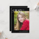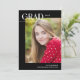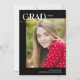 This modern graduation photo card features a chic editorial layout and a large photo. On the front, "Grad" is written in simple, trendy all caps lettering across the top left, with the graduation year to the right. The typography design overlaps a large vertical photo. At the bottom, add the graduate's name and school. The typography is white against a black background. The back of the graduation card includes an optional template to add graduation party details.