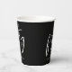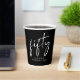 Fun 50th birthday party decor black paper cups that feature "fifty" showcased in a chic modern white script.