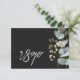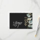 This elegant RSVP card features a sophisticated black botanical design with soft eucalyptus greenery along the edge, creating a romantic and modern wedding stationery style. The clean layout includes space for guest names, acceptance selection, guest count, and a convenient QR code for digital responses. The reverse side showcases a stylish black background with graceful script “RSVP” lettering and botanical accents, perfect for contemporary, minimalist, or garden-inspired weddings.