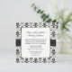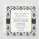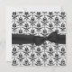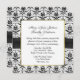 Elegant square custom wedding invitation done in a black and white damask pattern, with a black band, across the middle, and a golden edged white text square. The backside of the invitation has the same black and white damask pattern covering it and graphics of a black ribbon and bow, across the middle. Black text, on the front and back is fully customisable and ready to personalise for your special day. Matching products available.