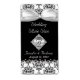 Elegant monogram mini wedding wine labels ready for you to personalise with your own information. Graphic artwork of a black label, with a black on white damask design on top and bottom. Graphics of a ornate silver tone plaque, in the centre has a one letter black monogram. A silver tone jewel like garland and a pretty white bow border the top and bottom of the text area. Great for your wedding reception or your home made wines.