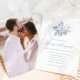 Beautiful dusty blue airy floral wedding invitation features elegant calligraphy script and pretty powder blue watercolor vintage style flowers on a classic white front. The back is one full photo.