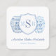 Preppy monogram business card design featuring a blue and white watercolor ginger jars. In front of this is a crest shape with space for a three letter monogram. The watercolor elements were originally handpainted by me in watercolors onto 100% cotton paper before being scanned and arranged / styled digitally (the crest shape is by another artist). You can change all text colours and fonts (click to customise further underneath the text customisation area - this will take you into the design tool).