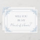 Create a memorable bridal party proposal for your Maid of Honour that is as timeless as your love with these shabby chic blue and white Minimal Wedding proposal cards that exude the perfect combination of simple elegant design with a coastal old money aesthetic. Versatile design is perfect for the couple that is creating a romantic theme with a classic combination of script and typography and a slightly retro vintage graphic element. Designed by Simple Desert Designs Studio. Message us for more customised colours to match your specific hue.