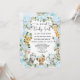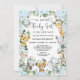 Celebrate the upcoming arrival of your little wild one with this whimsical jungle safari themed baby shower invitation. The design features a group of adorable safari animals and pretty watercolor blue flowers & lush greenery