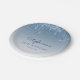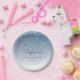 These chic, elegant 50th birthday party paper plates feature a sparkly blue faux glitter drip border and blue ombre background. Personalise them with the guest of honour's name in blue handwriting script, with her birthday and date below in sans serif font.
