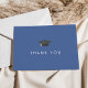 This chic blue grad cap graduation thank you card is perfect for a modern graduation party. The simple design features classic royal blue and white typography with a black and gold watercolor graduation hat.