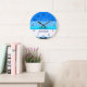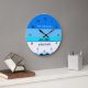 Persoanlize this Beach House Wall Clock with your Family Name, a perfect addition to your seaside retreat. This design features stripes of cool blues and turquoise reminiscent of the ocean, complemented by shades of white, dark and light blue that mimic the rolling waves of the sea. The clock's serene colour palette evokes a sense of calm, making it an ideal centerpiece for creating a relaxed and tranquil ambiance in your beach house. Also perfect as an Ocean Home Housewarming gift.