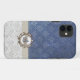 Lovely iPhone 5 case done in a vintage winter white and grayish damask pattern, on the bottom, and a blue vintage damask pattern, on the top. Graphics of a ivory ribbon runs between the two backgrounds. Digital graphics of a pearl decoration, on the ribbon, has a black and blue old world style font one letter monogram. Personalise the two tone initial for yourself or as a great gift idea.