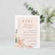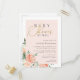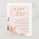 Elegant baby shower by mail postcard invitation featuring a faux gold foil script against a blush pink overlay with beautiful watercolor peonies and roses in shades of peach and cream. Your details are displayed with a simple, stylish typography. Simply click on "Personalise this template" and start adding your own details.