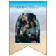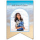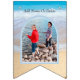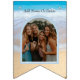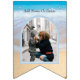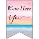 Chic Blush Pink and Purple Sunset Beach Wedding Bunting Flags with photo frames and script for those who can not attend the wedding. It features a Photo Arch Frame a text template for the name and a chic blue ocean background