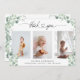 The images are within a fine white frame and green eucalyptus watercolor leaves decorate all the card. The text is on the top in a hand-written script.