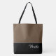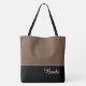 This lovely fashion forward tote bag shows the word "Bride" in white text colour over black with the upper tote bag in custom Latte Brown. Has plenty of room for personalised text. Graphics and text are on both sides of this tote bag. Black handle. Customise further or buy as shown.