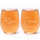 Elevate your bridal party's toasts with our unique set of 2 personalised stemless wine glass keepsake gifts for your bridesmaids and maid of honour to enjoy at your engagement party, bridal shower, bachelorette party, rehearsal dinner and wedding reception. These chic wine glasses will add a touch of elegance to each event and can be personalised with the name of your maid of honour, bridesmaids, mother, sisters, and more, in a stylish white calligraphy script and their role in elegant white serif typography.