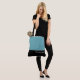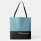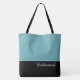 This lovely fashion forward tote bag shows the word "Bridesmaid" in white text colour over black with the upper tote bag in Tropical Pool Blue. Has plenty of room for personalised text. Graphics and text are on both sides of this tote bag. Black handle. Customise further or buy as shown.