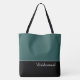 This lovely fashion forward tote bag shows the word "Bridesmaid" in white text colour over black with the upper tote bag in custom Emerald Sea Green. Has plenty of room for personalised text. Graphics and text are on both sides of this tote bag. Black handle. Customise further or buy as shown.